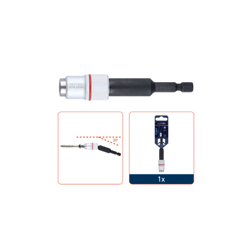 Het geïntegreerde kogelgewricht maakt het mogelijk om onder een hoek te werken tot 25–30°, ideaal voor moeilijk bereikbare schroefpunten. De compacte lengte van 65 mm zorgt voor een optimale balans tussen bereik en controle, terwijl de standaard E6.3 aansluiting compatibel is met de meeste bitsets en elektrische schroefmachines.